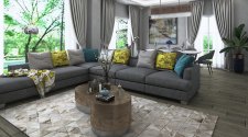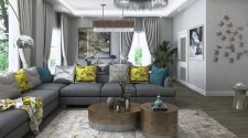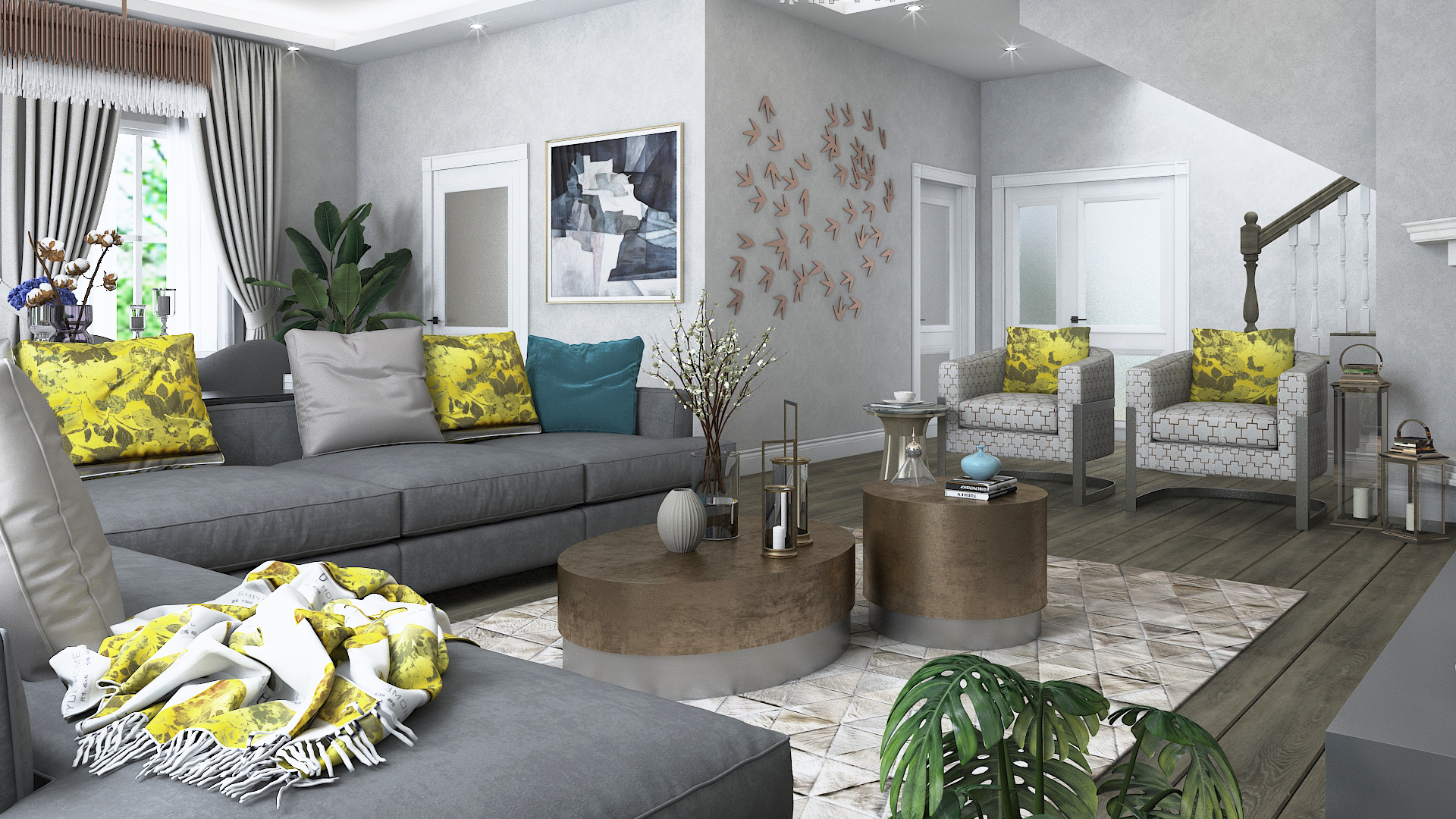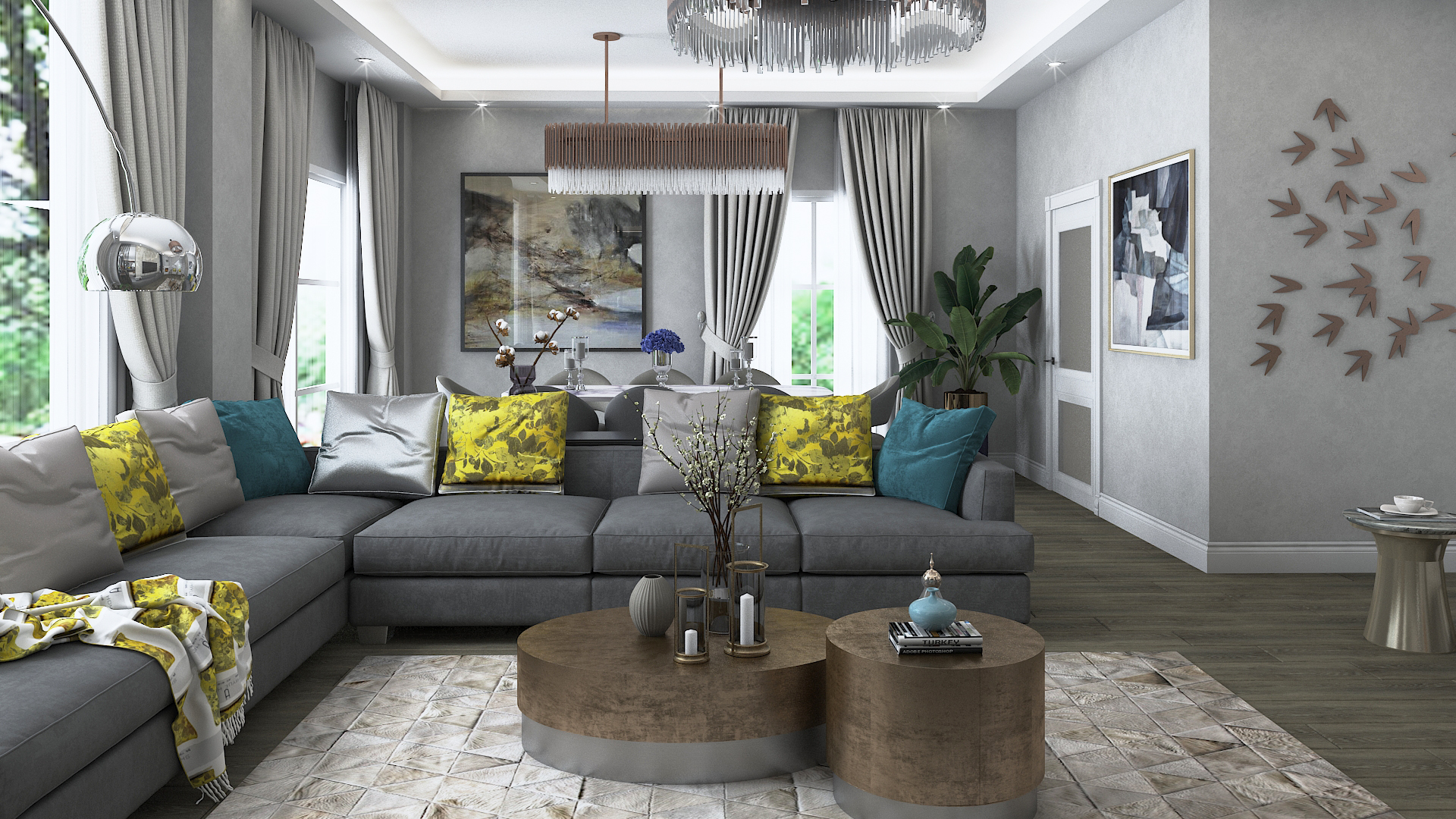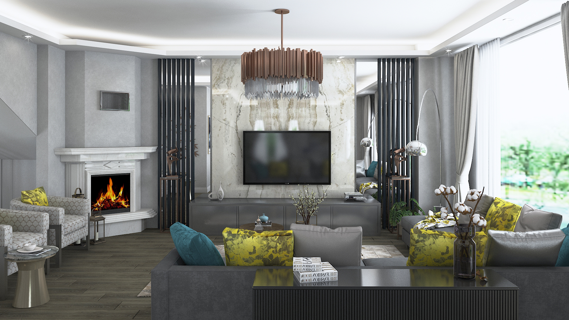 Ağırlıklı olarak grinin hakim olduğu modern salonumuzda aydınlatma elemanları ve aksesuarların seçiminde, renk ve materyal olarak bu
