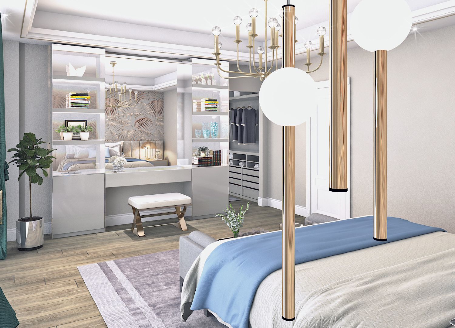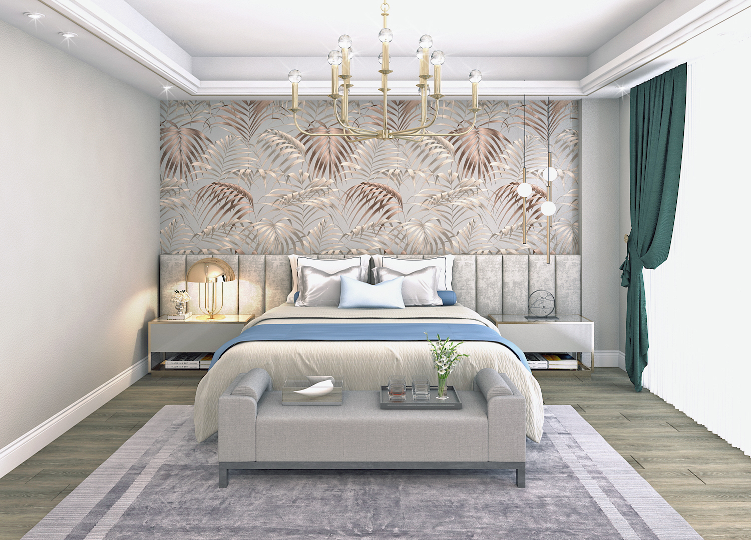 Sadeliğin ve pastel tonların ön plana çıktığı yatak odamızda, egzotik duvar kağıdımızla yaşayan bir mekan tasarladık.